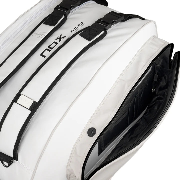 Nox ML10 Team 2025 balta/pilka padelio krepšys – puikus pasirinkimas žaidėjams, ieškantiems stilingo, funkcionalaus ir kokybiško aksesuarų sprendimo. Sukurtas kartu su charizmatišku Miguel Lamperti, šis krepšys talpina iki 55 litrų, leidžiant patogiai nešiotis visą įrangą.